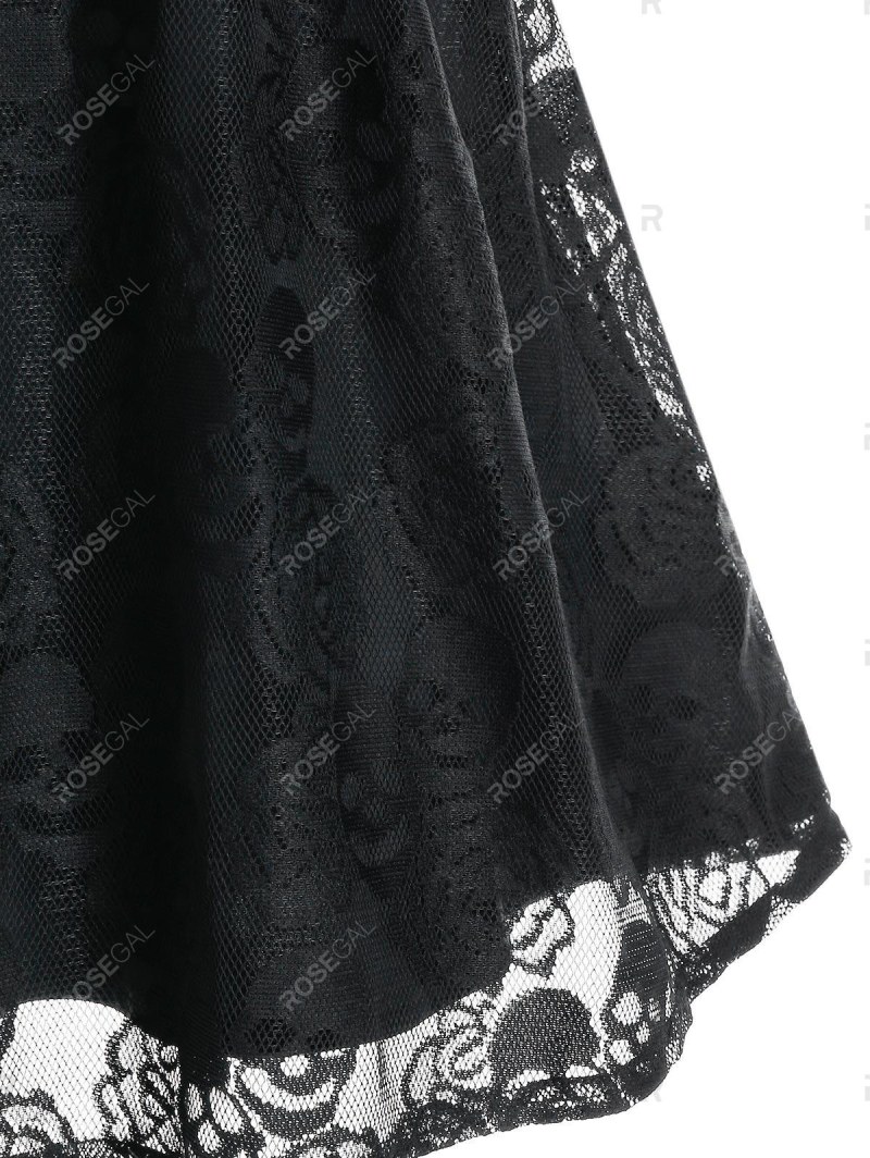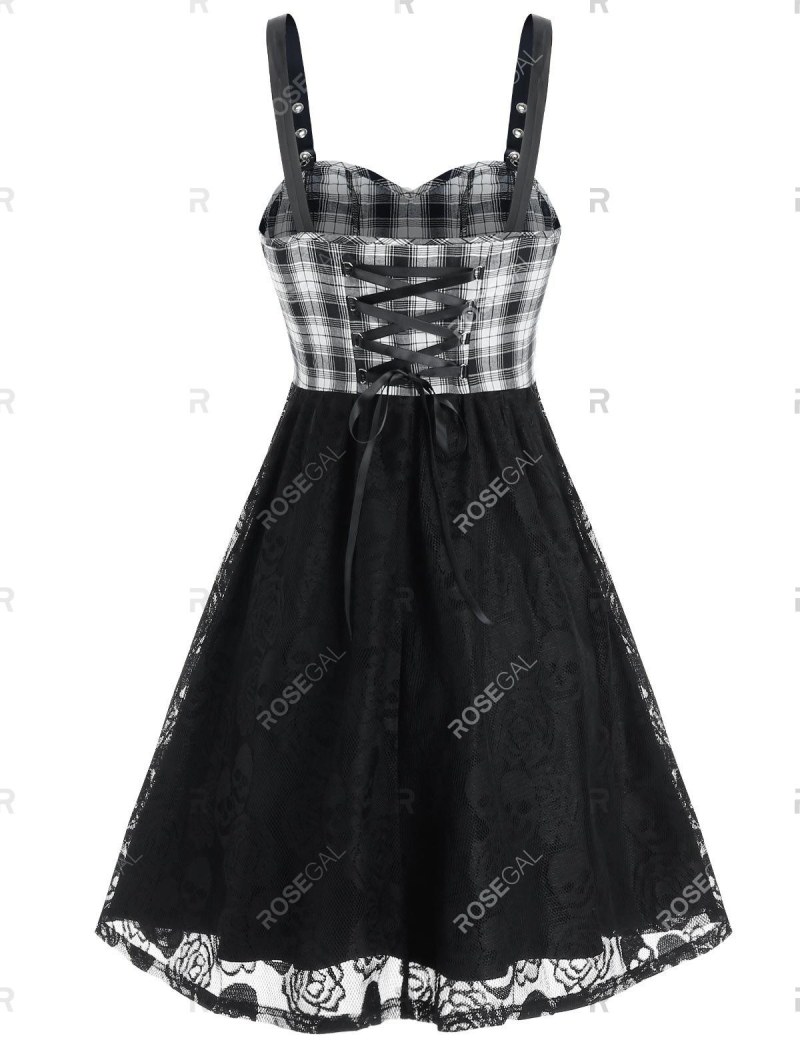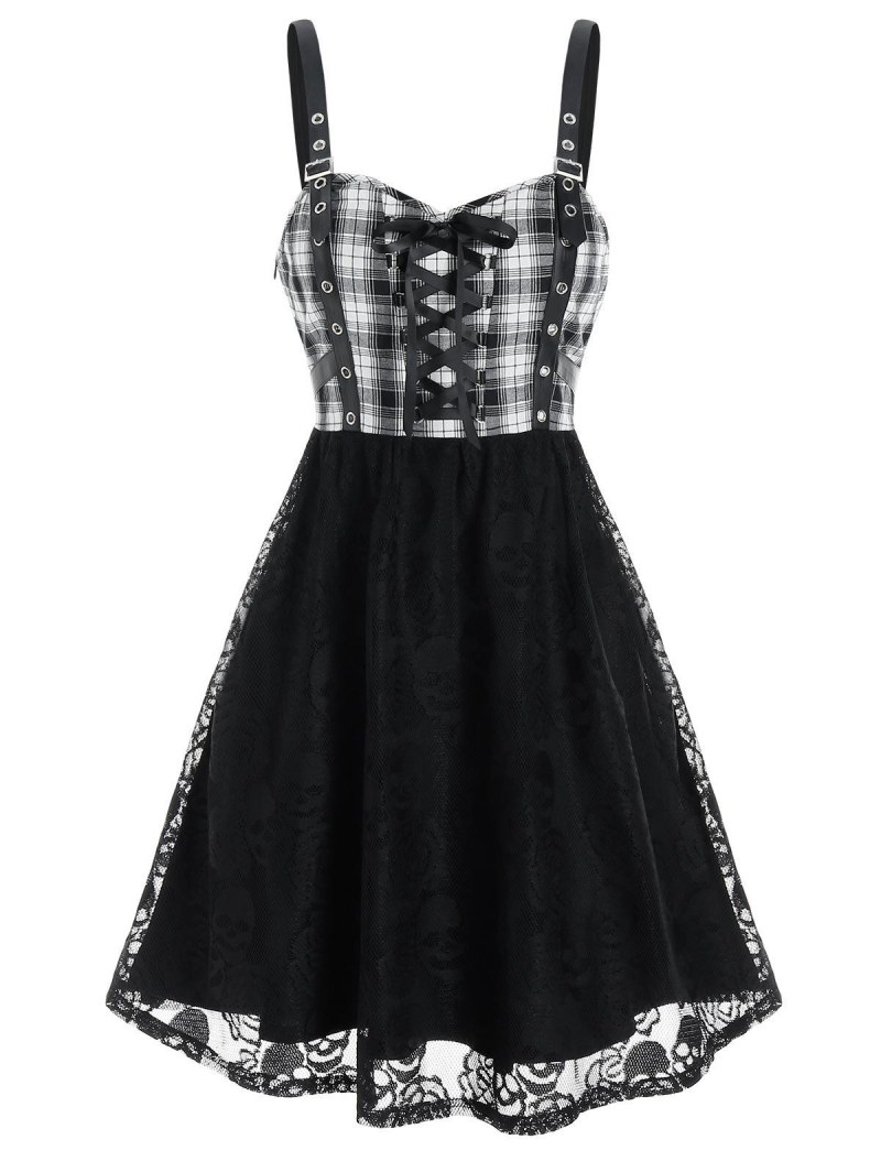 Halloween Skull Lace Insert Plaid Print Sleeveless Dress