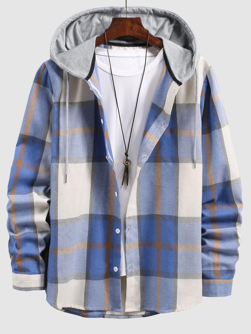 Check Print Contrasting Hooded Shirt