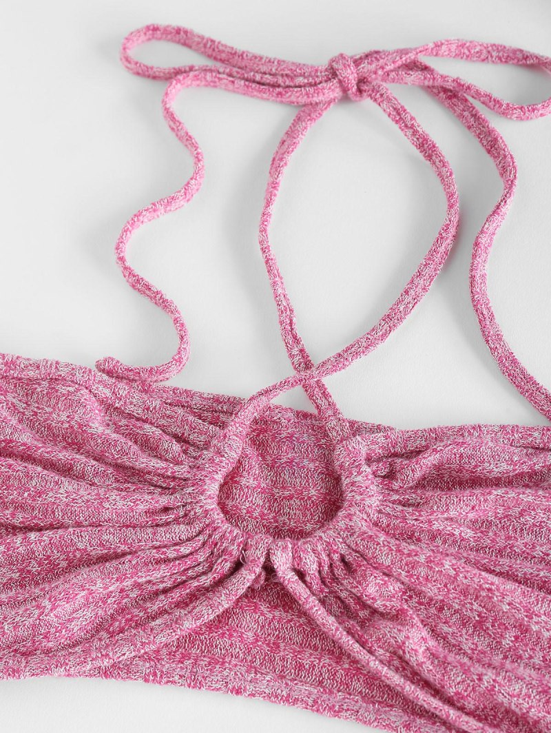 Criss Cross Halter Heathered Ribbed Button Up Top Set